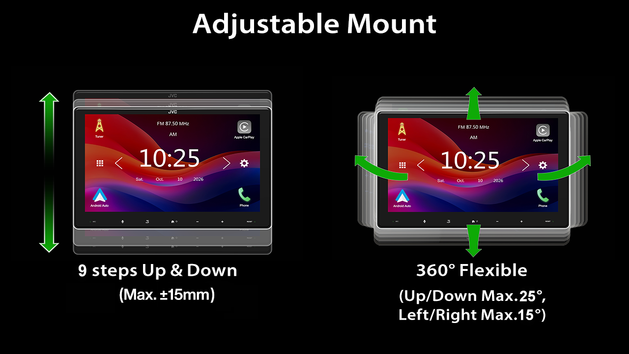 The fully adjustable display allows drivers to rotate and tilt the screen 360, offering easy angle adjustments with tilt, left and right motion for optimal viewing.